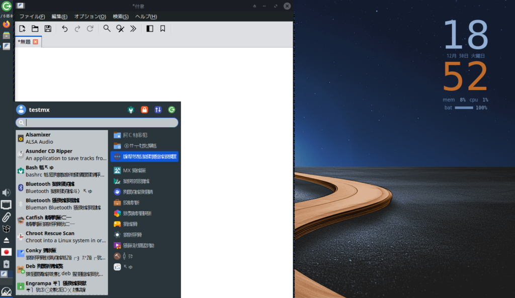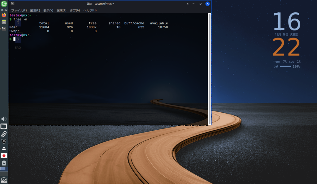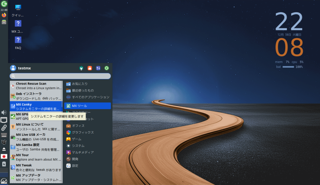 MXではおなじみの左側タスクバーですね。下が良ければMXTweakの「配置」の値を変更すれば上下左右好きな位置に配置できます。