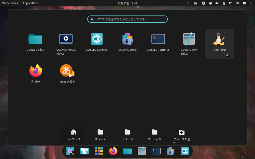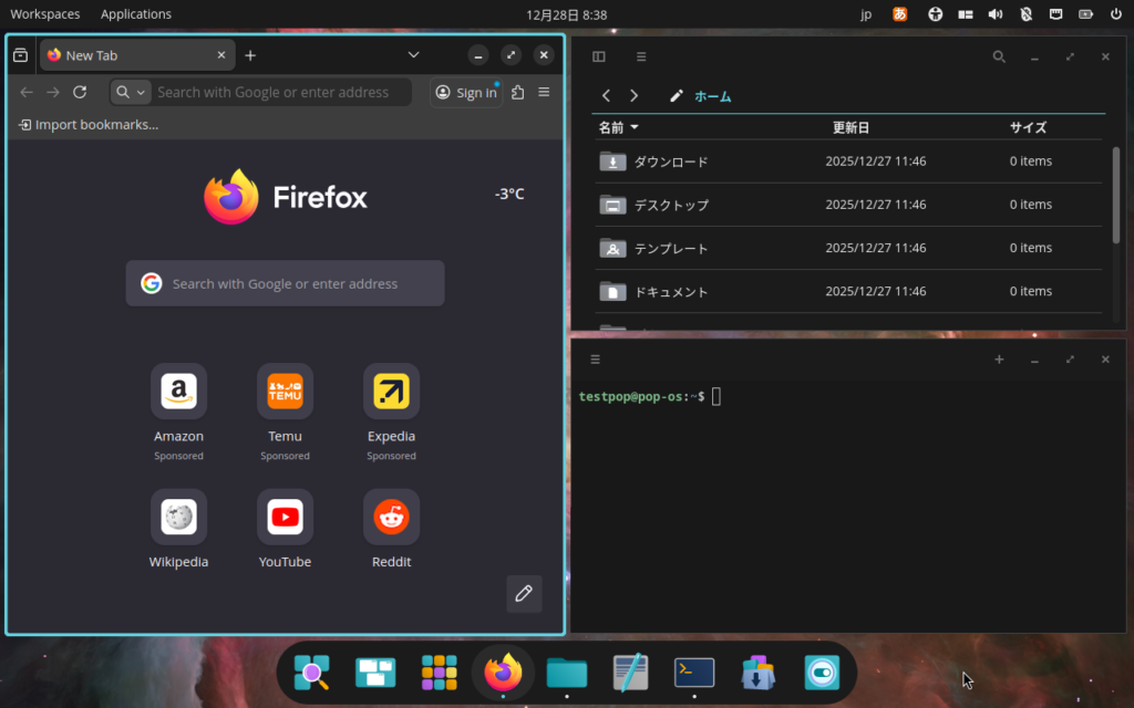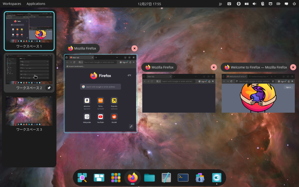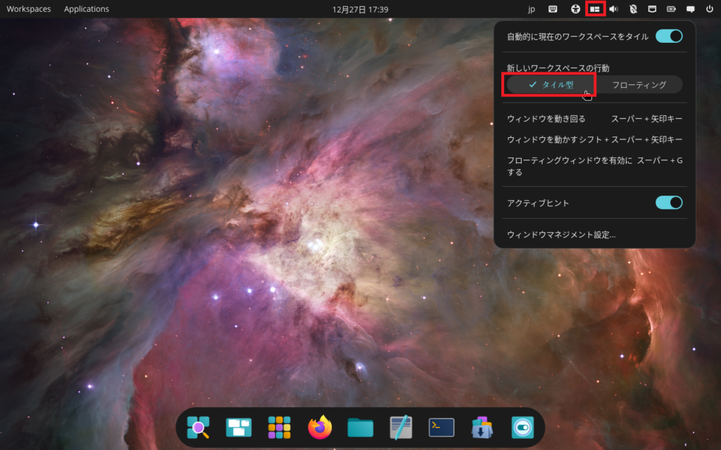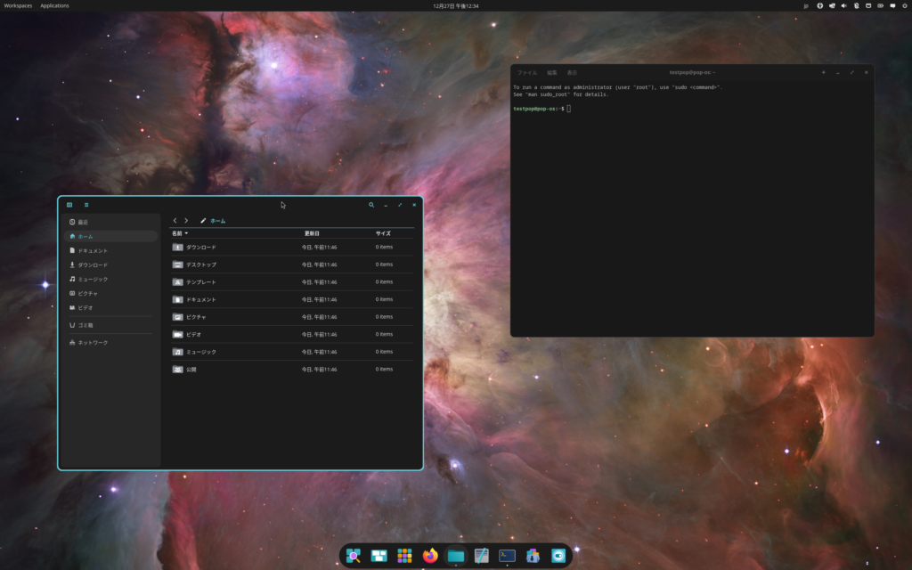 Pop!_OSはGnomeベースの独自デスクトップ環境のcosmicを採用しており,これがなかなか高機能で,ここがPop!_OS最大の目玉とも言えるでしょう。この後詳しく見ていきます。