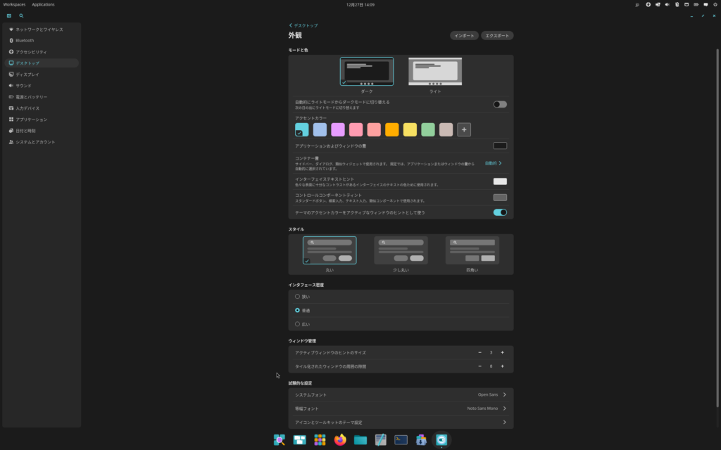 色合いやUIについては,設定アプリの「デスクトップ」タブの「外観」から変更できます。かなり細かく設定できそうです。