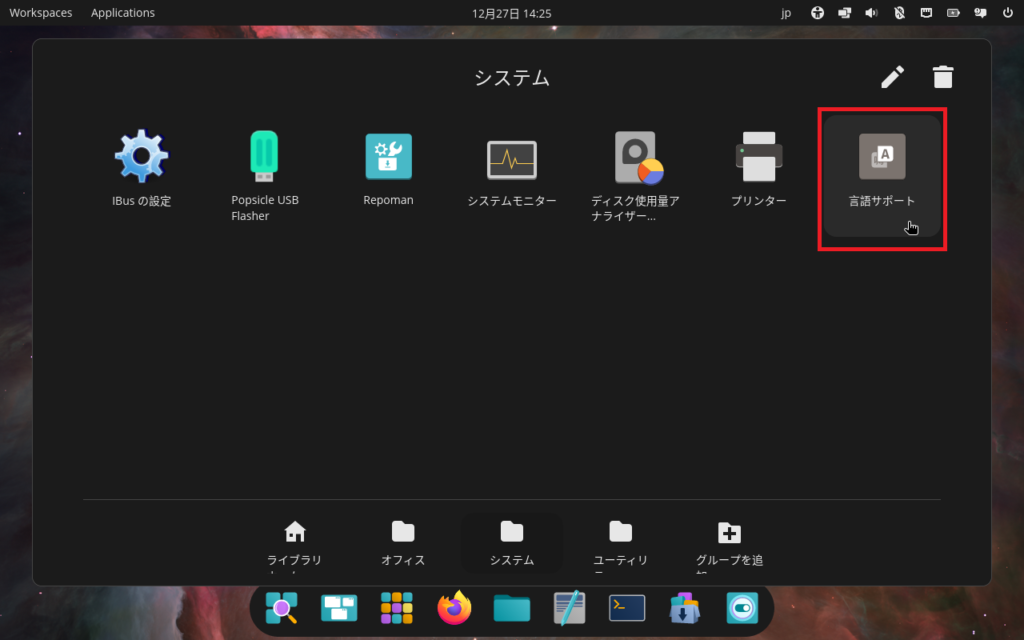 アプリ一覧の「システム」タブ内に「言語サポート」というアプリがあるので,これを起動します。