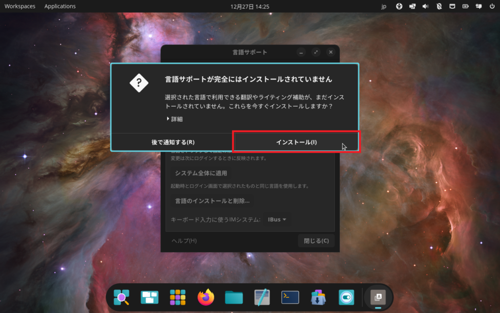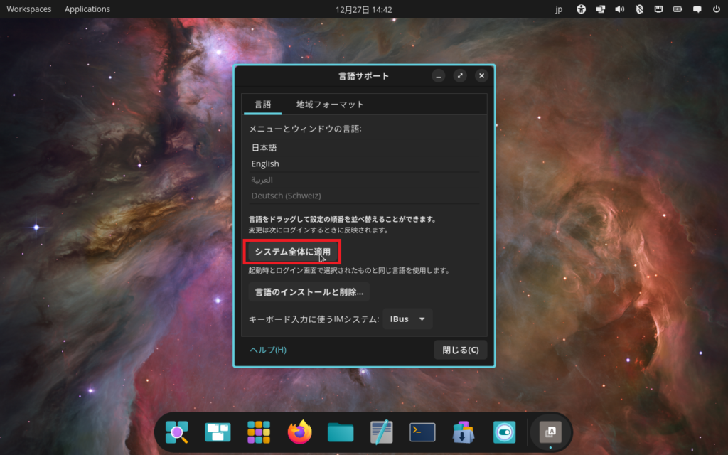 もう一度言語サポートを開き,「システム全体に適用」を押します。