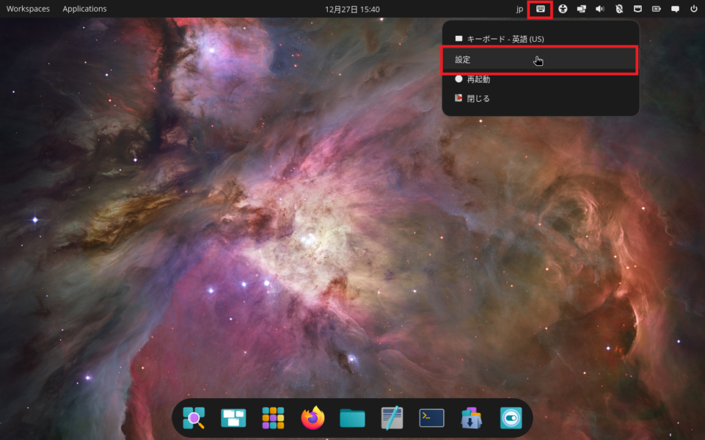 アプリ一覧から「fcitx5」を起動させると,上のバーにキーボードアイコンが現れるので「設定」をクリックして設定ウィンドウを開きます。