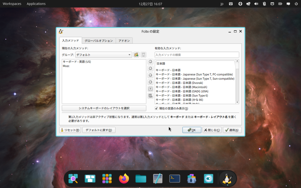 これで再起動すれば今度こそmozcが選択できるので,設定ツールの右側から左側にmozcを移動させておきましょう。左側はmozcのみにしておくとなお安心です。