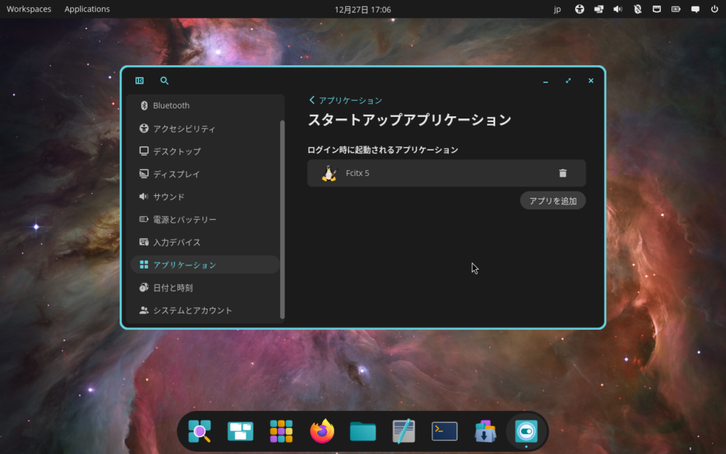 設定画面の「アプリケーション」タブ内の「スタートアップアプリケーション」にて,「Fcitx5」を追加することで自動起動されるようになります。